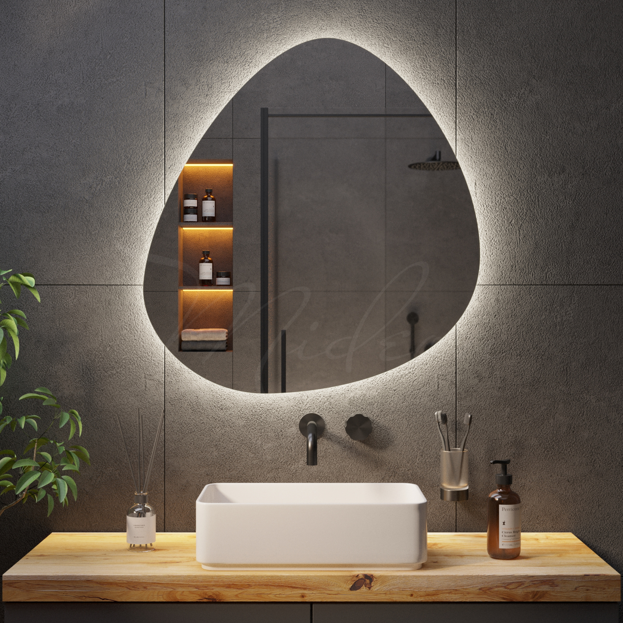 Все наши зеркала с подсветкой необычной формы имеют толщину всего 24 мм благодаря применению современной LED (светодиодной) подсветки, премиальных комплектующих и собственным производственным наработкам.