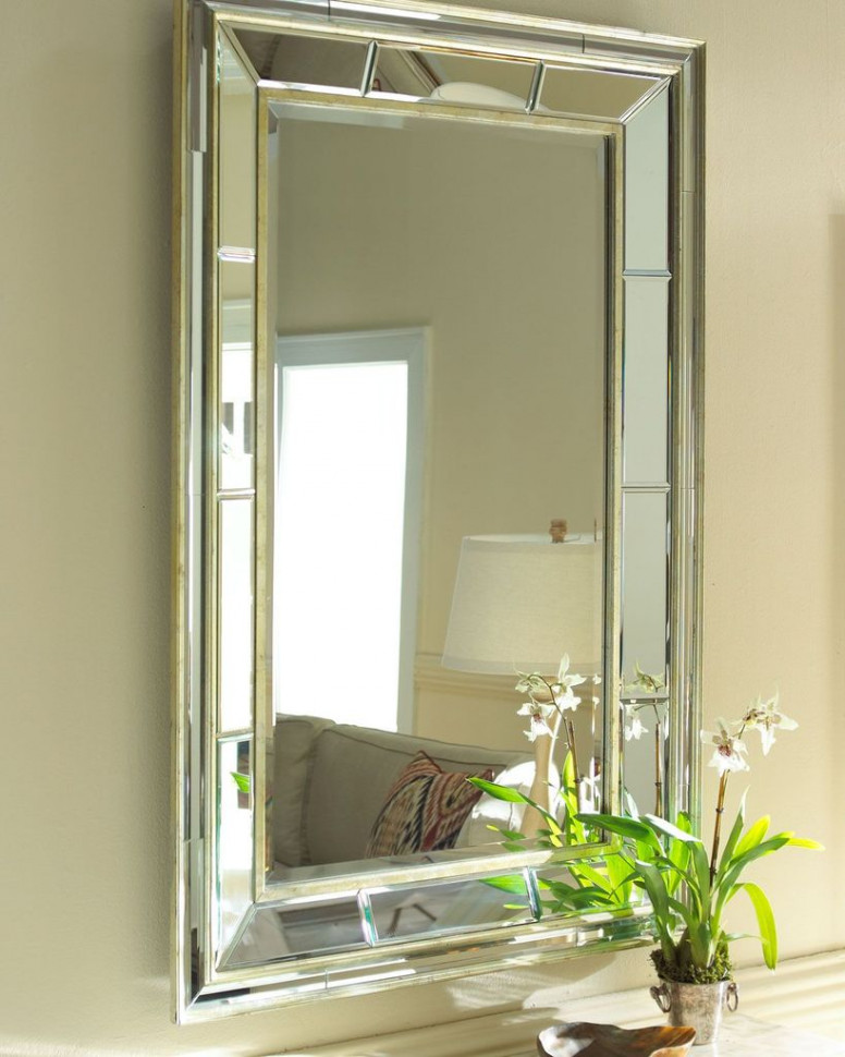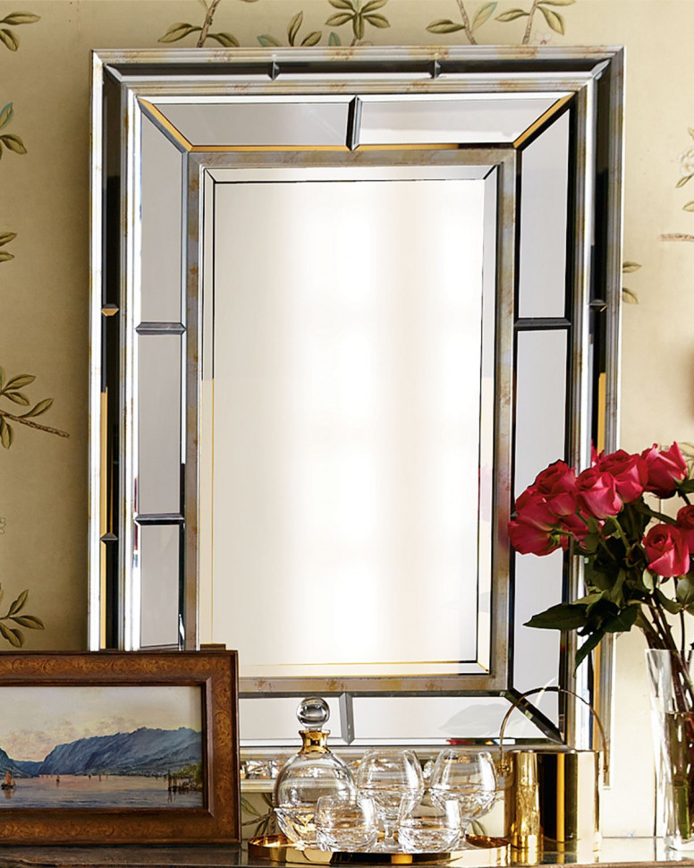 Прямоугольное настенное зеркало “Сибил” в стиле “ар-деко“, имеет скошенную двойную зеркальную раму, которая выполнена в состаренном серебристо-золотом цвете. Модель этого зеркала отлично создаст объём и украсит любое пространство в Вашем доме, оно оснащено четырьмя креплениями и может разместиться на стене как в пейзажной ориентации, так и в портретной.